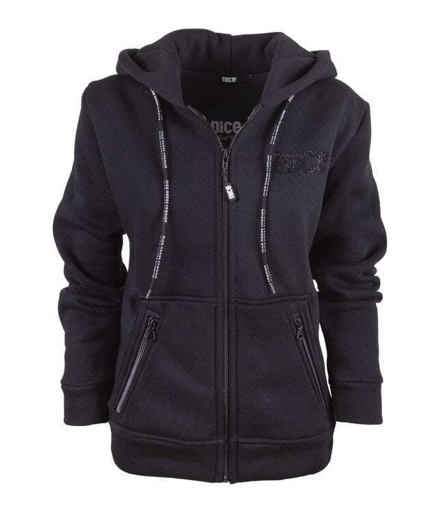 Fleece-ZIP NICE Allblack. Diese sportliche supersofte Fleece Sweatjacke ist Dein perfekter Begleiter für die kommende Jahreszeit. Zusätzlich hat die Jacke große Fronttaschen mit Reißverschluß. Die aufgeraute Flausch-Innenseite ist warm und äußerst bequem. Abgerundet wird das Modell mit Glitzersteinen und Stickdetails.